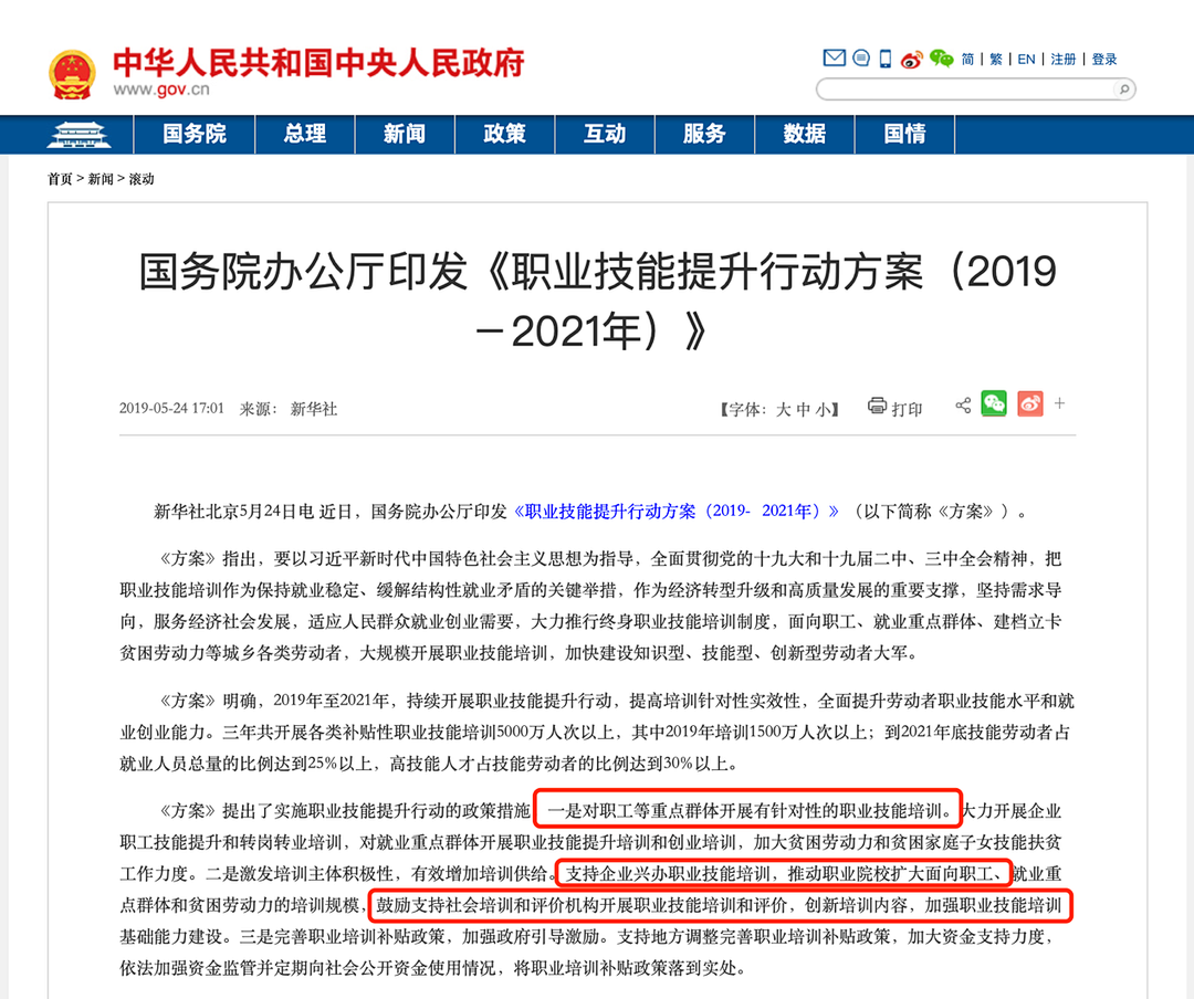 2019年05月24日,国务院办公厅印发《职业技能提升行动方案(2019-2021年)》,对职业技能提升做出了相应规划,从对职工等重点群体开展培训、鼓励支持社会培训和评价机构开展职业技能培训和评价、完善职业培训补贴政策等方面做出要求。