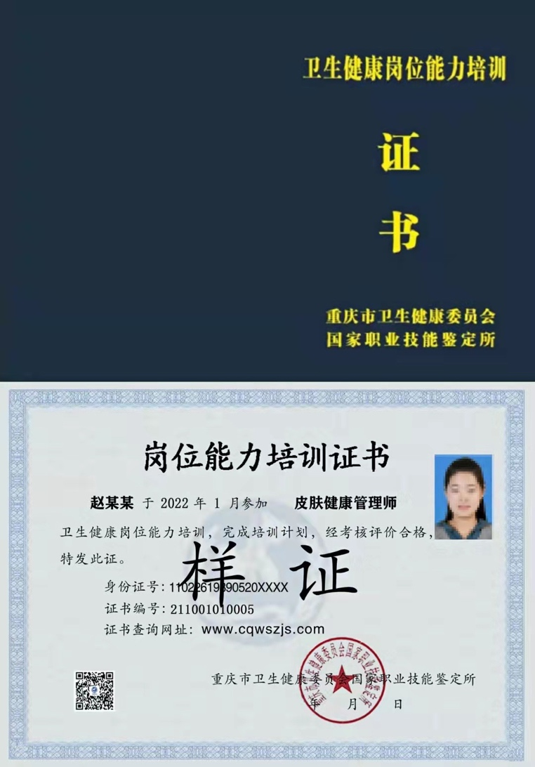 学完规定课程,参加考试合格者,由卫生健康行业专业评价机构﹣重庆市卫生健康委员会国家职业技能鉴定所考核测评并颁发《皮肤健康管理师岗位能力培训证书》,由中国人口文化促进会颁发《皮肤管理师卫生健康人才岗位技能培训证书》。证书证明持证人参加并通过卫生健康岗位能力培训项目考核合格,作为求职择业和用人单位选人用人的参考依据,证书信息录入重庆市卫生健康技能人才网(www.cqwszjs.com)、中国人口文化促进会官网www.cnpca.cn,全国可查询。