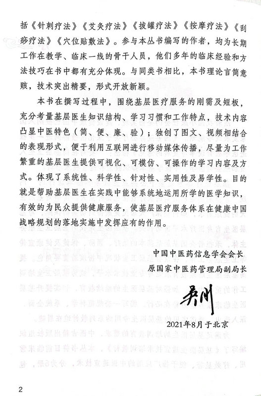 本书在撰写过程中,围绕基层医疗服务的刚需及短板,充分考量基层医生知识结构、学习习惯和工作特点,技术内容凸显中医特色(简、便、廉、验);独创了图文、视频相结合的表现形式,便于利用互联网进行移动媒体传播,尽量为工作繁重的基层医生提供可视化、可模仿、可操作的学习内容及方式。体现了系统性、科学性、针对性、实用性及易学性。目的就是帮助基层医生在实践中能够系统地运用所学的医学知识,有效的为民众提供健康服务,使基层医疗服务体系在健康中国战略规划的落地实施中发挥应有的作用。