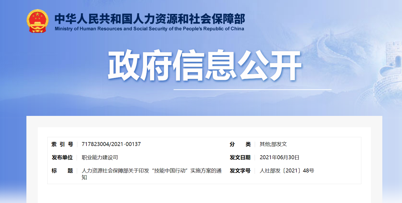 为贯彻落实习近平总书记对技能人才工作的重要指示精神,我部决定在“十四五”期间组织实施“技能中国行动”。现将《“技能中国行动”实施方案》印发各地,请结合实际贯彻执行。